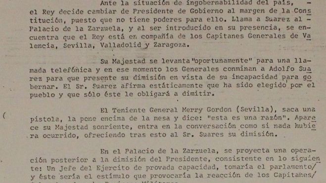 Entre los panfletos adjuntos al informe figura una versión especialmente dramática: el teniente general Pedro Merry Gordon habría colocado una pistola sobre la mesa ante Suárez para forzar su dimisión, mientras el Rey se ausentaba oportunamente. La escena, de ser cierta, alteraría por completo la lectura de la crisis política previa. Pero no existe constancia judicial que la respalde. Lo relevante no es tanto su veracidad como su circulación: el rumor transforma una dimisión política compleja en un acto de coacción militar avalado por la Corona.