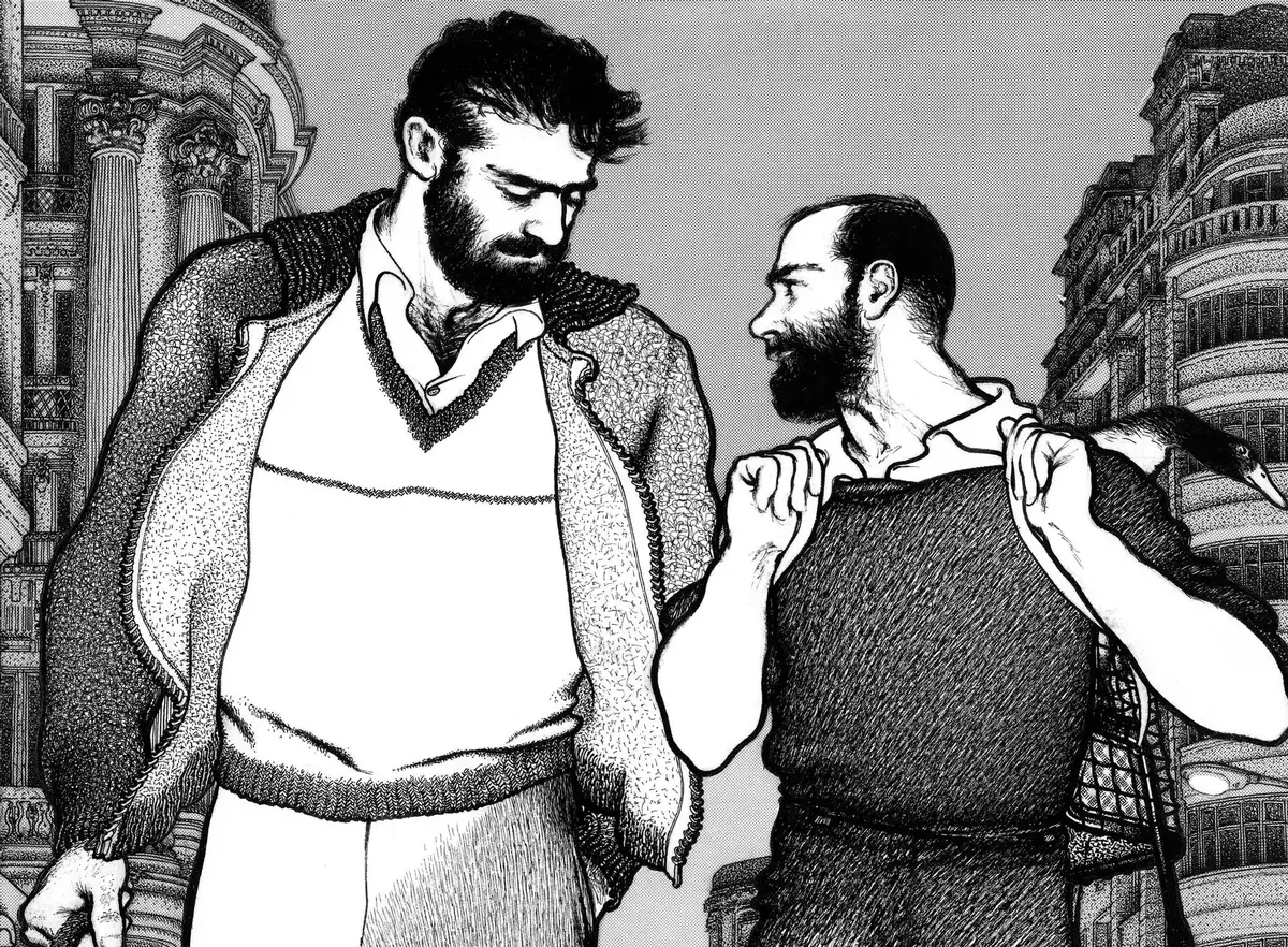 La escultura captura con pasión el deseo no consumado de Rodrigo, representándose a sí mismo en una pose íntima con Manuel, en un gesto de abrazo y cercanía que va más allá de lo físico para tocar lo esencial del corazón humano. La obra se convirtió en una expresión tangible de su afecto y admiración, primero a través de un cómic y luego en esta conmovedora escultura.