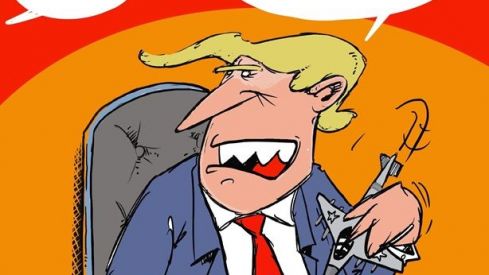 Caricatura de Donald Trump sentado a un escritorio, con expresión infantil y enfadada, jugando con un avión de guerra, un tanque y un soldadito de juguete. Alguien fuera de plano le pregunta "¿Mr. Trump?" y él responde en un bocadillo: "¡ESTOY OCUPADO! ¡NO MOLESTÉIS MÁS!".
