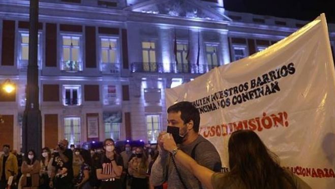 La rueda de prensa de la presidenta regional terminó por enervar los ánimos. Los manifestantes se concentraron en la Puerta del Sol sobre las 20.00 horas, después del anuncio de Ayuso de que se restringirá a partir del lunes la movilidad en las 37 áreas sanitarias de la región más afectadas por el coronavirus, la mayoría al sur y cuyos habitantes sólo podrán desplazarse a otros lugares para ir a trabajar y cumplir obligaciones legales o educativas, entre otros supuestos.