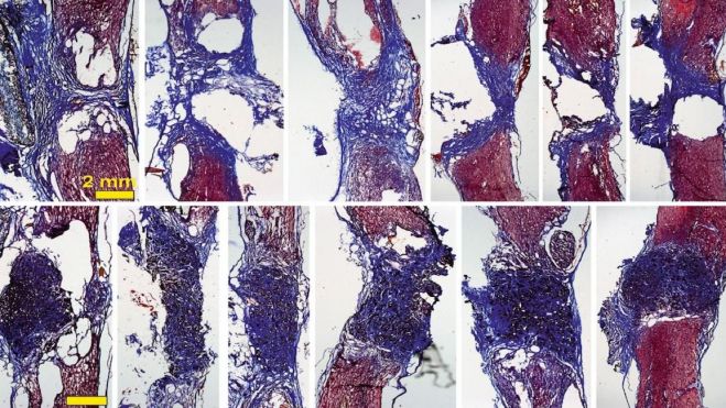 De esta manera, cuando se coloca el scaffold en la médula espinal –en este caso en un modelo de rata con la médula espinal completamente seccionada a nivel torácico–, "vemos que aparecen gran cantidad de vasos sanguíneos, que son fundamentales para nutrir el nuevo tejido, y neuritas (los filamentos que unen unas neuronas con otras)". La investigadora explica que con esto se observa “cómo las neuronas que han sobrevivido en la zona alrededor de la lesión proyectan sus prolongaciones a través del scaffold y lo invaden en toda su extensión 3D". Todo esto, además, mejora con el tiempo: los resultados son incipientes tras 10 días de implante, pero son mucho más prometedores a los 4 meses.